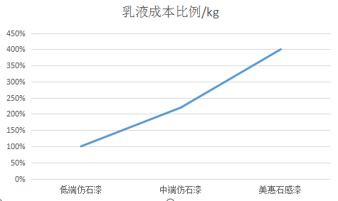 若以每千克最低端仿石漆的乳液成本为基准,其一般采用苯丙乳液,乳液成本价格比例为100%;