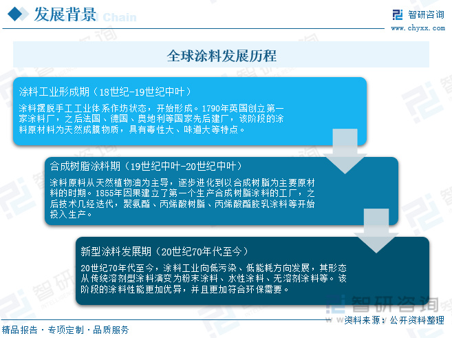 涂料是油漆的一种,指涂布于物体表面在一定的条件下能形成薄膜而起保护、装饰或其他特殊功能的一类液体或固体材料。其发展历程可分为三个阶段:首先,在18世纪-19世纪中叶,是涂料工业形成期,该阶段的涂料原材料主要以天然成膜物质,具有毒性大、味道大等特点,故而又称作油漆;到20世纪中叶之前,涂料原料从天然植物油为主导,逐步进化到以合成树脂为主要原材料的时期,因而称之为涂料;20世纪70年代至今,为迎合可持续发展的需求,涂料工业逐步向低能耗、低污染的方向发展,其形态从传统溶剂型涂料演变为粉末涂料、水性涂料、无溶剂涂料等。