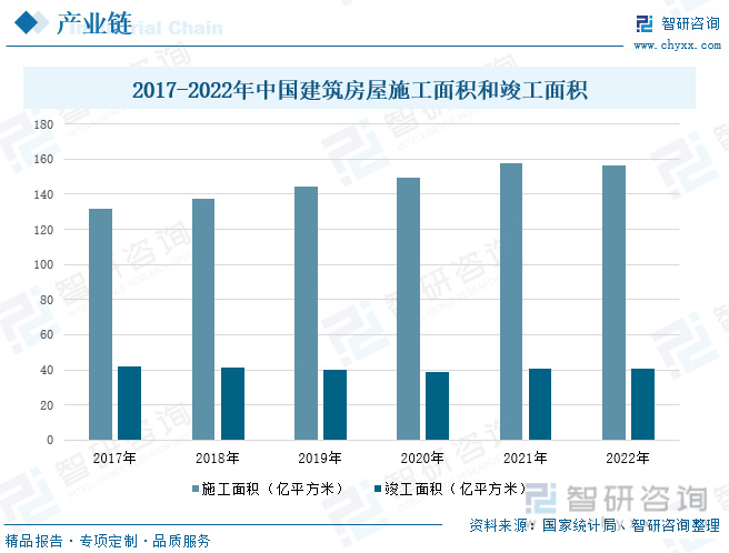 近年来,有越来越多的城市开展“旧城改造”的活动,改造城市规划结构、改善城市环境、调整工业布局、改善城市居住环境并组织大规模的公共服务设施建设,相应产生了大量建筑涂料的需求。同时,由于我国一二线城市土地资源有限,部分城市中心地段已无住宅用地可供使用,在此情况下,二手房交易市场火热,由此带来的城市存量房屋的二次装修市场,并且产生了日益旺盛的建筑涂料翻新需求。此外,根据国家统计局数据,我国建筑业房屋施工面积在2017-2021年保持逐年增长的趋势,2022年建筑业房屋施工面积达到156.45亿平方米,房屋竣工面积达到40.55亿平方米。未来随着城镇化率的不断提高,人们收入水平逐渐上涨,在建筑涂料方面的需求也将会上升,进而带动涂料行业的迅猛发展。