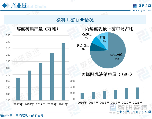 涂料作为一种高度依赖原材料的产品,对上游材料成膜物质和助剂的需求量较高。其中成膜物质是涂料最基础的物质,决定了涂料的主要性能,一般以合成树脂和乳液组成。而其合成树脂中用量最大的三种树脂分别为醇酸树脂、丙烯酸树脂、环氧树脂,其中醇酸树脂产能充足,其产量在2017-2021年间保持良好的增长态势,而丙烯酸树脂和环氧树脂主要依赖于进口。乳液在原材料成本中,占比达到30%,也属于成本支出大头。丙烯酸乳液是一种具有广泛适用性的化学品,在其应用领域中,建筑行业应用最为广泛,随着房地产行业的快速发展,对涂料的需求增加,进而促进丙烯酸乳液行业的发展。在2021年,我国丙烯酸乳液销售量达到389.56万吨,较2020年同比增长8.30%。
