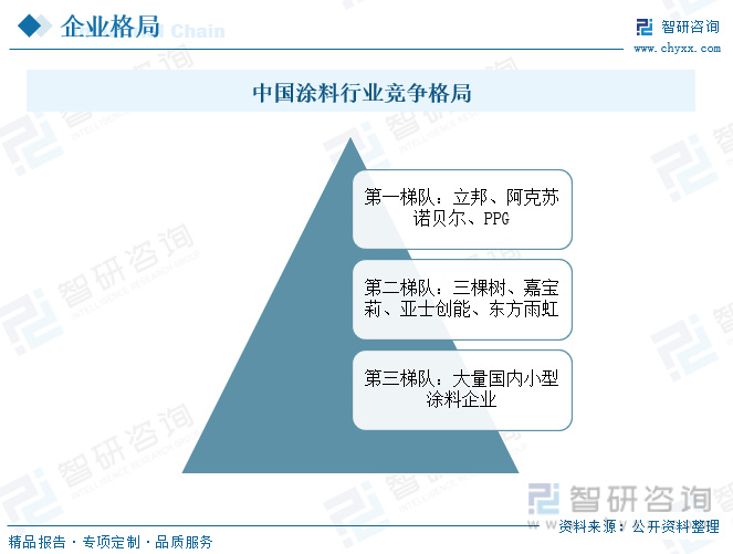 目前,涂料制造商可分为三大梯队。其中第一梯队均为外企,包括立邦、阿克苏诺贝尔、PPG等等,具备涂料产品全品类覆盖的能力,在中国具备极高的市场份额;第二梯队为我国涂料龙头企业,近年来,国产品牌快速崛起,市场占有率逐步提升,特别是三棵树、东方雨虹等企业,在细分市场具备相对优势;第三梯队为我国大量小型涂料企业,反映出我国涂料整体现状,存在大量生产低 质量、赚取微薄利润的制造商。