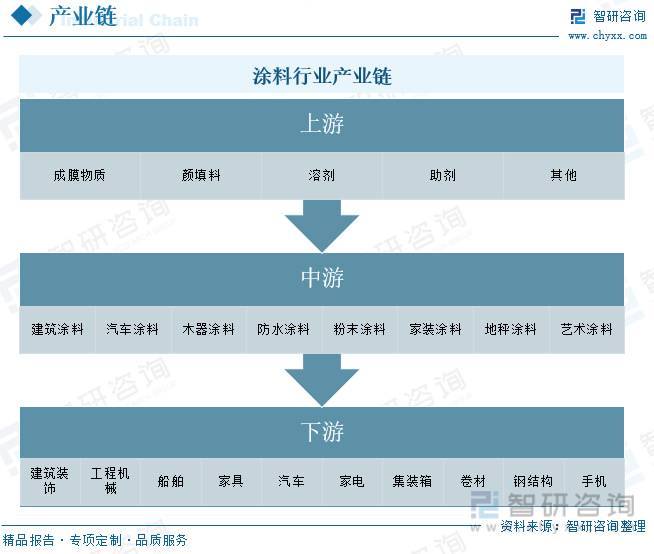 涂料行业上游环节为原材料,中游是指涂料的生产制造环节,下游是指涂料的主要需求市场。其中上游主要由成膜物质、颜料填料、溶剂和助剂等原材料组成;下游市场主要包括建筑、工业、汽车、船舶、家具、家电等领域。