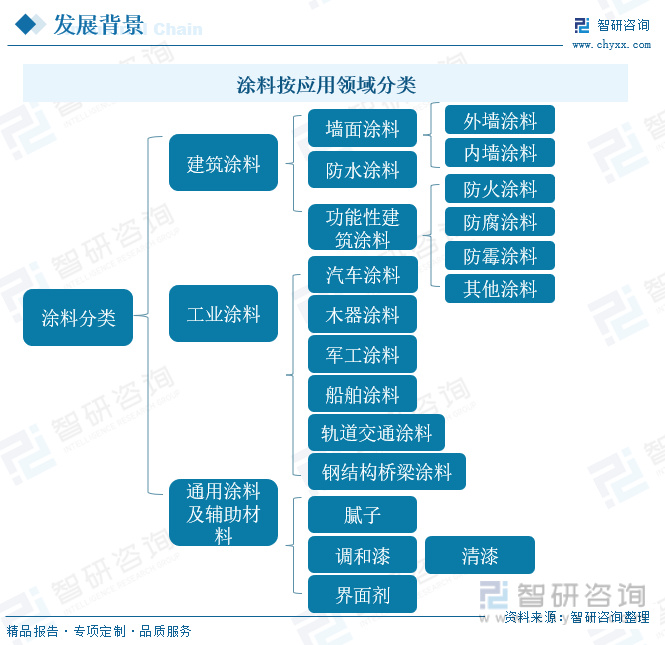 一、发展背景:涂料可分为建筑涂料、工业涂料、通用涂料及辅助材料