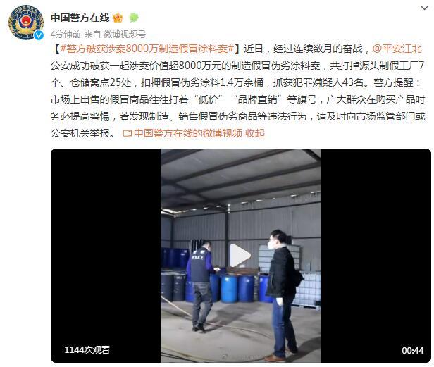 近日,经过连续数月的奋战,@平安江北 公安成功破获一起涉案价值超8000万元的制造假冒伪劣涂料案,共打掉源头制假工厂7个、仓储窝点25处,扣押假冒伪劣涂料1.4万余桶,抓获犯罪嫌疑人43名。警方提醒: 市场上出售的假冒商品往往打着“低价”“品牌直销”等旗号,广大群众在购买产品时务必提高警惕,若发现制造、销售假冒伪劣商品等违法行为,请及时向市场监管部门或公安机关举报。