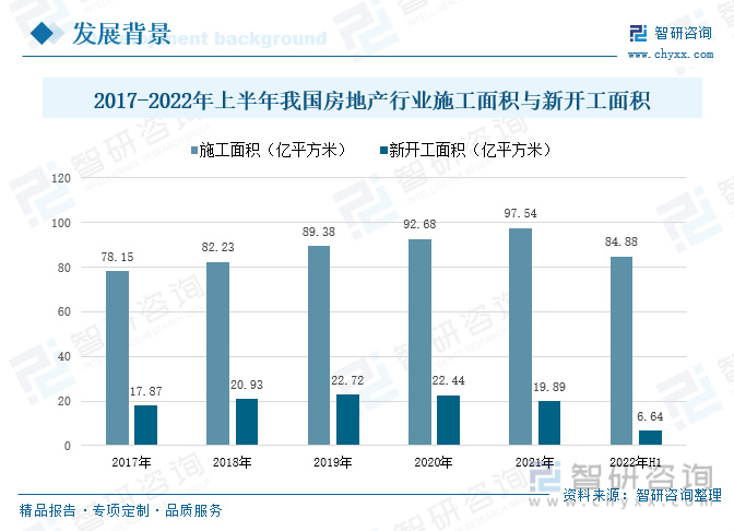 在我国城镇化进程的持续推进下,房地产行业也得到稳步发展,2017-2021年期间,我国房地产行业的施工面积保持持续增长的态势,新开工面积呈现“先升后降”的趋势,2021年我国房地产施工面积同比增长了5.24%;新开工面积同比出现下滑,同比下降了11.36%。进入2022年,房企供给侧改革开始发力,各项政策相继推出,市场表现不佳,投资出现下滑,且续建项目不足和新开工面积大幅下滑。2022年上半年我国房地产开发企业房屋施工面积848812万平方米,同比下降2.8%;新开工面积66423万平方米,下降34.4%。现阶段,我国城镇化发展逐渐走向成熟,国家新基建、新型城镇化、旧城改造、乡村振兴等策略机遇将成为水性涂料行业的需求新增长点,推动水性涂料行业持续发展。