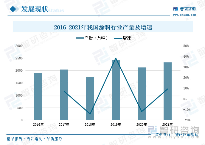 近年来,随着国民经济中各行业的稳步发展,作为其配套的涂料行业逐步发展成为国民经济中各领域不可或缺的重要行业。现如今,我国已经成为世界第二大涂料生产国和消费国,进入到世界涂料行业的发展主流。2016-2021年期间,我国涂料行业的产量总体保持增长的态势,2021年涂料产量共计2324.3万吨,较2020年增长了9.22%。随着国家对于环保行业的愈发重视,涂料产业在发展过程中,也将更加注重环保问题,减少各类污染的产生,推动产业转型升级,推动涂料行业产量的持续提升。水性涂料作为现如今涂料行业的发展主流,适应环境和政策的发展趋势,在涂料行业的高速发展阶段,水性涂料也将得到快速发展,产量实现进一步增长。