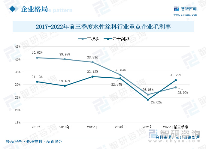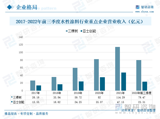 随着水性涂料行业竞争的不断加剧,大型水性涂料企业间并购整合与资本运作日趋频繁,国内优秀的水性涂料生产企业愈来愈重视对行业市场的研究,特别是对企业发展环境和客户需求趋势变化的深入研究。一大批国内优秀的水性涂料品牌迅速崛起,三棵树、亚士创能等企业逐渐成为水性涂料行业中的领先企业。三棵树供应业务为建筑涂料、防水材料、地坪材料、木器材料、保温材料及保温一体化板、基辅材的研发、生产和销售。亚士创能主营功能型建筑涂料、建筑墙体保温装饰一体化材料、建筑节能保温材料、防水材料及其应用系统的研发生产、销售及服务,是行业内少数同时拥有这四大产品体系及其系统服务能力的企业之一。