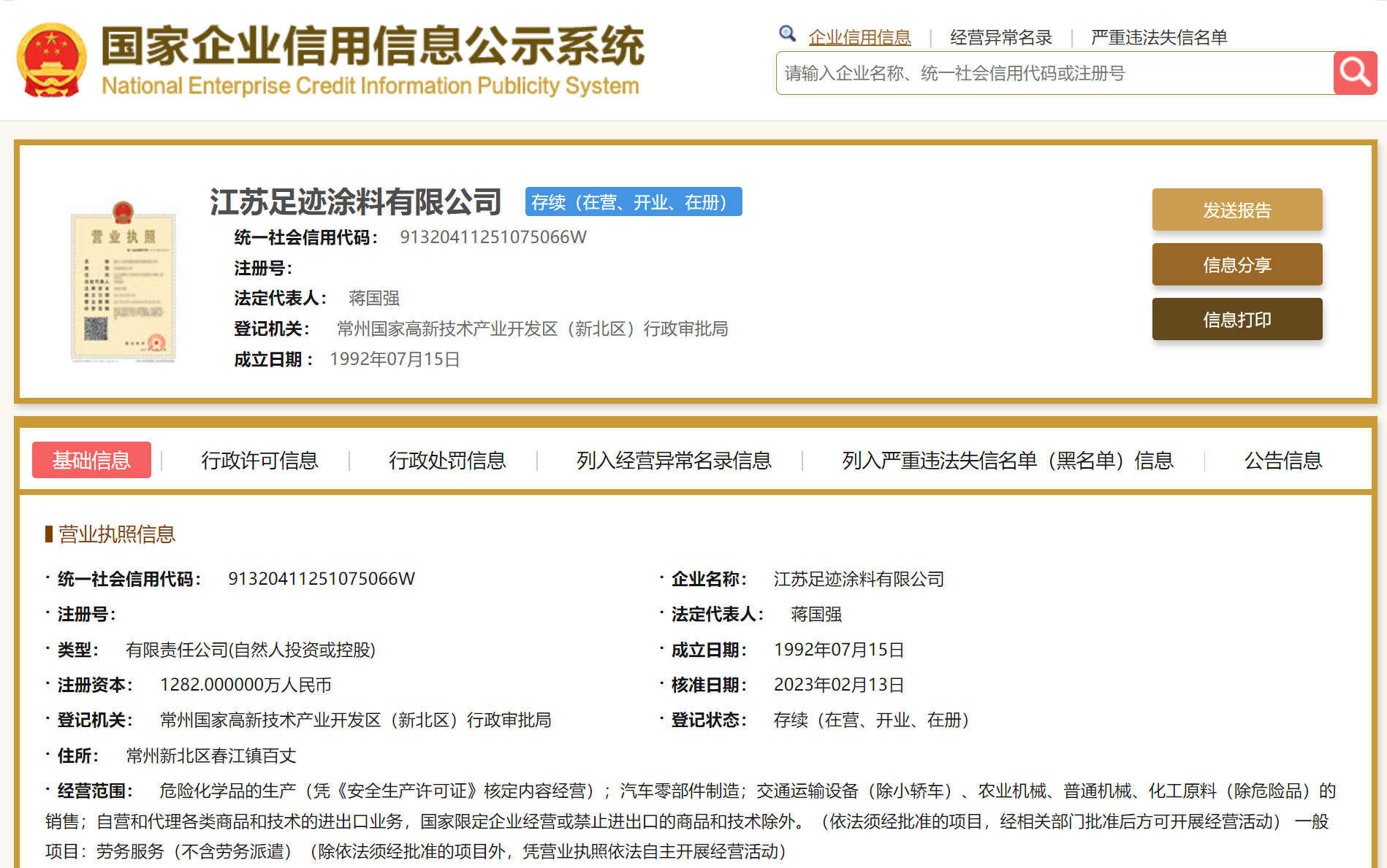 乐居财经 邓如菲 2月15日消息,企查查显示江苏足迹涂料有限公司(以下简称“足迹涂料”)经营范围新增劳务服务。