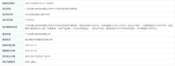 广东巴德士新材料有限公司:总投资5108万元,在中山市南头镇正兴路108号建设年产5万吨水性涂料扩建项目,总用地24.9亩,总建筑面积27339平方米,建1栋研发办公大楼、2栋生产车间。