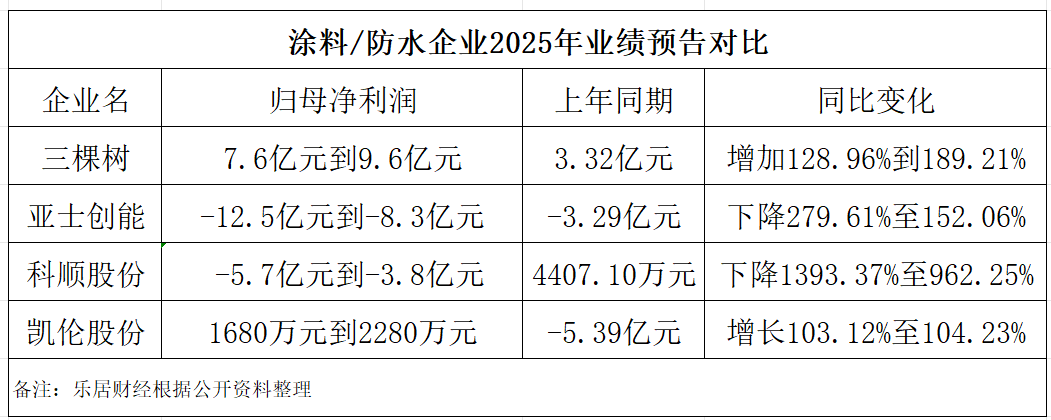 截至目前,三棵树、科顺股份、亚士创能、凯伦股份(维权)已经发布了2025年业绩预告,这四家企业的业绩呈现剧烈分化。